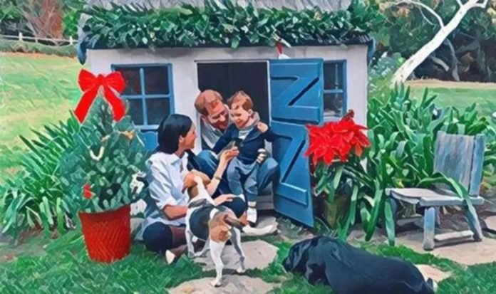 The image features Prince Harry and Archie sitting at the front of a wooden children’s play cottage, with Meghan slightly further forward. Oz and Guy, the family’s dogs, are also included.