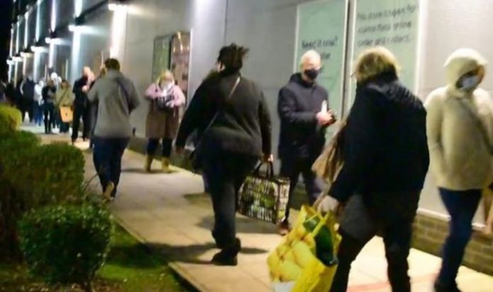 In the footage from the M&S store in North Tyneside, shoppers can be seen queuing in single file and wearing masks. The footage, which was taken at 7am on Tuesday morning, shows the long queue stretching around the entire outside of the Marks and Spencer shop.