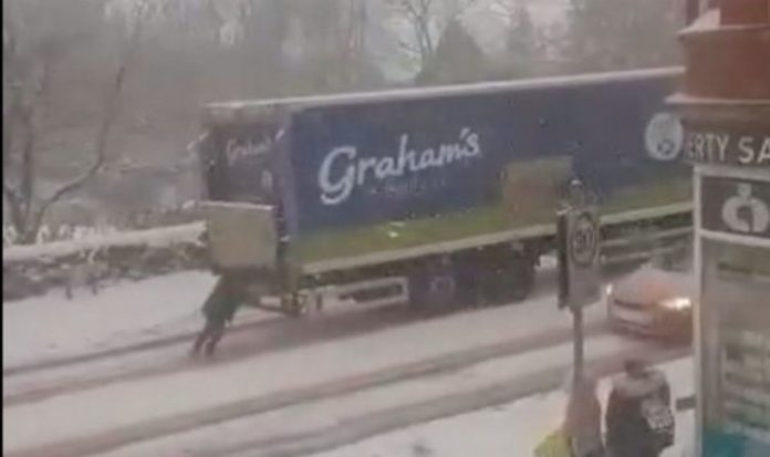 The video of Charlene Leslie, 33, heaving a Graham’s Family Dairy lorry up a hill during a snowstorm was shared on the Fife Jammer Locations Facebook page. The post was captioned “Just your average Cowdenbeath woman pushing a lorry up a hill” accompanied by three strong arm emojis.
